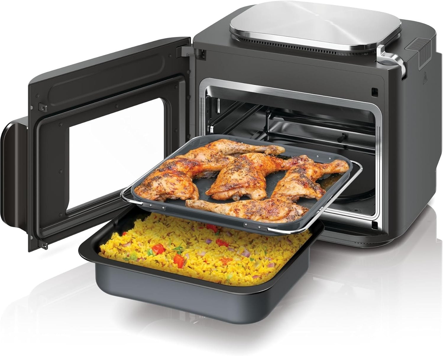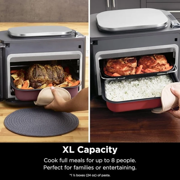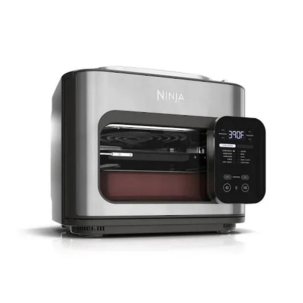 اما جذابیت دستگاه مولتی کوکر و سرخ کن نینجا در سرعت بالای پخت آن میباشد که با وجود مصرف بهینه انرژی، وعده های غذایی را در بازه های زمانی 15 و 30 دقیقه آماده میکند. علاوه بر این، ظرفیت بالای فر نینجا کمک میکند تا وعده یا میان وعده های دلخواه را در حضور خانواده یا دوستان، در حجم بالا طبخ کنید. تصور کنید یک گوشت استیلی ضخیم را با مواد دلخواه ترکیب کرده و به سادگی با انتخاب برنامه تخصصی آن، در انتظار بافت جذاب و طعم لذیذ آن باشید. ابعاد فضای داخلی به گونه ای بوده که یک پیتزا با قطر 10 اینچ به سادگی درون آن جای میگیرد. البته که باوجود سینی و ظرف های متفاوت و قابلیت چند طبقه ای شدن، به سادگی میتوان چند نوع مواد غذایی را بصورت همزمان پخت کرد.